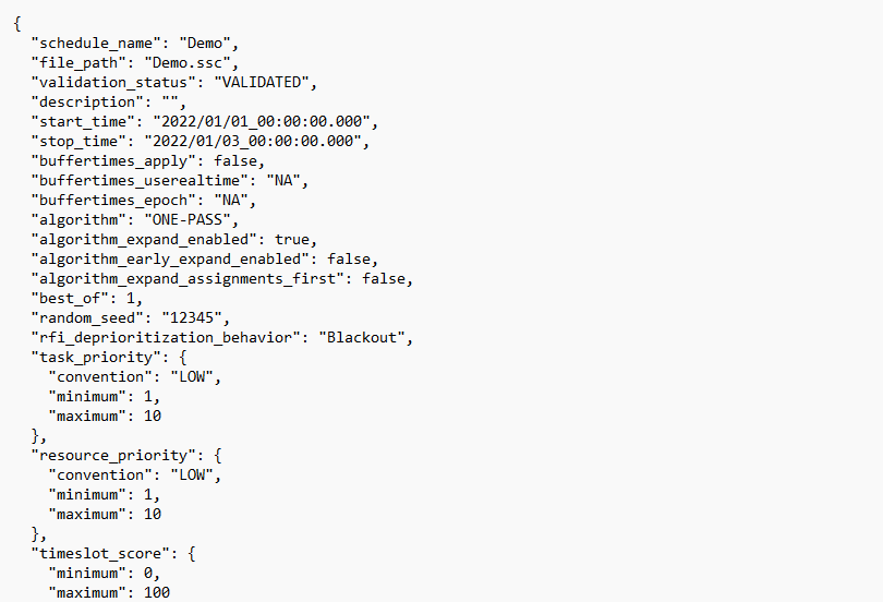 The schedule report is designed to provide information about the definition of the active schedule in such a manner that it may be programmatically parsed using an external application. The report consists of a header section and a schedule details section.