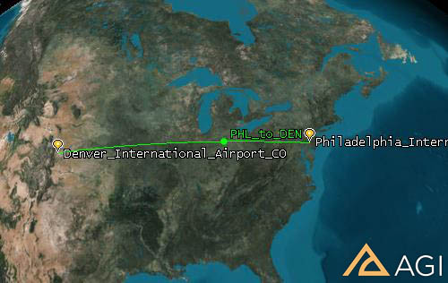 ) button. - Shift-click on the 3D Globe to add waypoints to the route. Enter a waypoint near Philadelphia, then a waypoint near Denver.