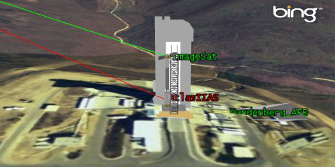 The Vandenberg AFB launch pad was imported from the STK Standard Object Database. If you bring the 3D Graphics window to the front. The shadow on the ground in the Bing Maps being used is the shadow of the actual launch tower at Vandenberg. In addition to the positioning being technically accurate, the scenario also uses a 3D model of the real Atlas launch pad (atlas-lp.mdl) that was provided as part of the STK install. Pretty cool!