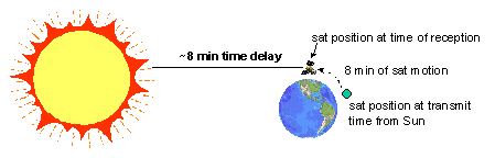 The following figure illustrates the impact of light time delay on the first access calculation in a Sun-satellite-facility chain: