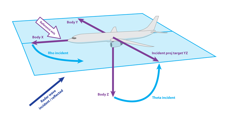 - Rho from X-axis. The reference axis for the measurement of the RCS is the target's body frame x-axis. The