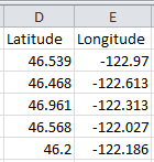- Enter the following coordinates into the workbook by copying and pasting the below information.