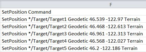 - Copy and paste the following text string to cell F9: "SetPosition" & " " & "*/Target/" & A2 & " " & "Geodetic" & " " & D2 & " " & E2 & " " & "Terrain"