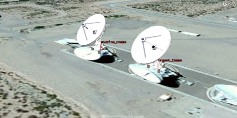 There are only two satellite reception parabolic antenna dishes available and they sit next to each other. Although the communications are coming from different locations, they are being routed through the same satellite to the ground facility.