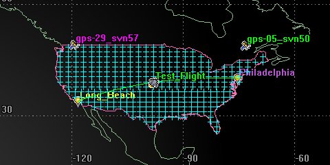 To determine the accuracy of the GPS position throughout Test_Flight’s flight, you need to assign the GPS satellites as assets for that object. To assess the quality of that coverage, in this instance, you would choose a navigation accuracy figure of merit type, then review the value of the PACC as Test_Flight flies from Long Beach to Philadelphia.
