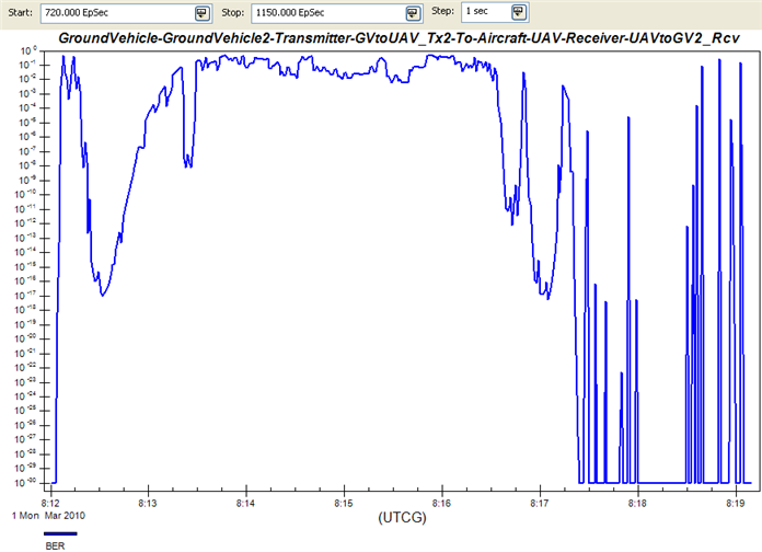 - In the Link Budget report, look at the BER for 1 Mar 2010 08:18:25, which is when the UAV is directly above GroundVehicle2, and the BER value is at its minimum. The report also shows that the link performs poorly at 1 Mar 2010 08:16:25, as the BER is many orders of magnitude greater than two minutes later.