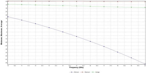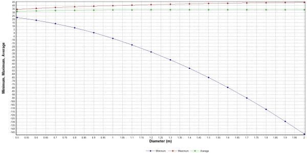 Notice that while the maximum and for the most part average Eb/No values rise with increasing antenna size, the minimum value decreases. The maximum coverage value increases with increasing antenna diameter, however you do see diminishing returns. The reason for this is that as antenna size increases, the gain increases while the Beamwidth decreases. Locations farthest from the antenna boresight see their Eb/No values drop as the Beamwidth decreases. Take a closer look at the average coverage.
