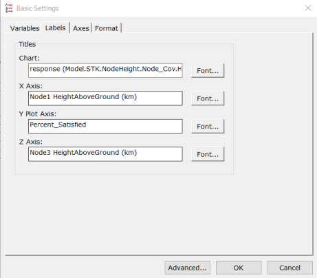 - Since both variable names are the same (HeightAboveGround), it’s hard to distinguish which is which on the plot. We can change the labels in the chart settings. Click Chart on the menu bar, and select Basic Settings. The X axis corresponds to the first design variable (Node1) and the Z axis corresponds to the second design variable (Node3). We could check the Variables tab to confirm this if desired. Set the X and Z axis labels as shown below.
