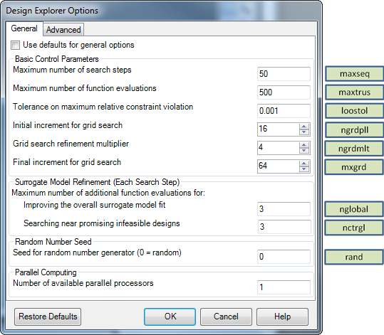 Maximum number of function evaluations for improving the surrogate model fit [nglobal=3]: Controls the maximum number of times per search step that your analysis will be executed to improve the overall quality of the surrogate models. Put another way, this parameter controls the maximum number of model improvement points that will be generated at each search step. See Task 5