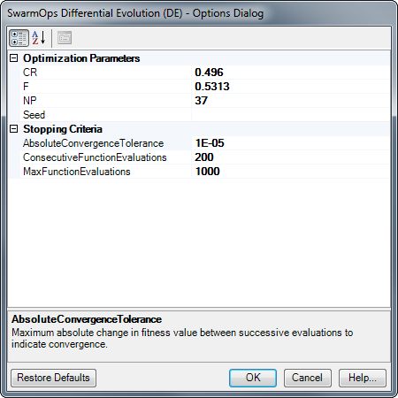 | AbsoluteConvergenceTolerance | 1E-05 | Maximum absolute change in fitness value between successive evaluations to indicate convergence. The value specified must be greater than 0. |