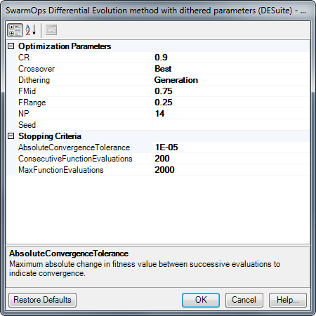 | AbsoluteConvergenceTolerance | 1E-05 | Maximum absolute change in fitness value between successive evaluations to indicate convergence. The value specified must be greater than 0. |