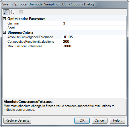 | AbsoluteConvergenceTolerance | 1E-05 | Maximum absolute change in fitness value between successive evaluations to indicate convergence. The value specified must be greater than 0. |