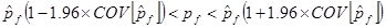 Notice that the COV is a function the failure probability, the sample size, and the importance density. The COV can be used as an error estimate or as a convergence criterion to determine the number of samples necessary to achieve a given error requirement. By approximating the sampling distribution as a normal distribution, approximate error bounds can be obtained on the true failure probability. For example, at the 95% confidence level, the confidence interval for pf is: