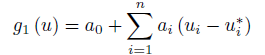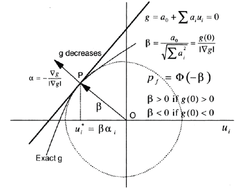 The FORM probability solution is based on the linearization of the g-function at the MPP in the u-space. The first-order polynomial g1(u), is: