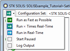 - In the upper left corner of the STK SOLIS window, click the drop-down arrow next to the green button and Select Run x Times Real-Time.