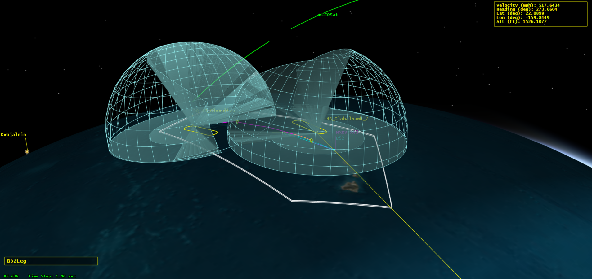 Improve the ability to communicate test objectives to all participants with visualizations of key test points along the flight. STK analysis products, such as dynamic data displays, color contoured flight lines, and sensor volume displays, help to highlight concepts in an intuitive and easy to understand manner. Use the STK 3D animation environment to review the flight plan and highlight specific areas of interest, relative positioning of key members of the test, and the flow of events through time. The TETK capability as a briefing tool enables you to demonstrate test execution in a highly flexible and technical display environment.