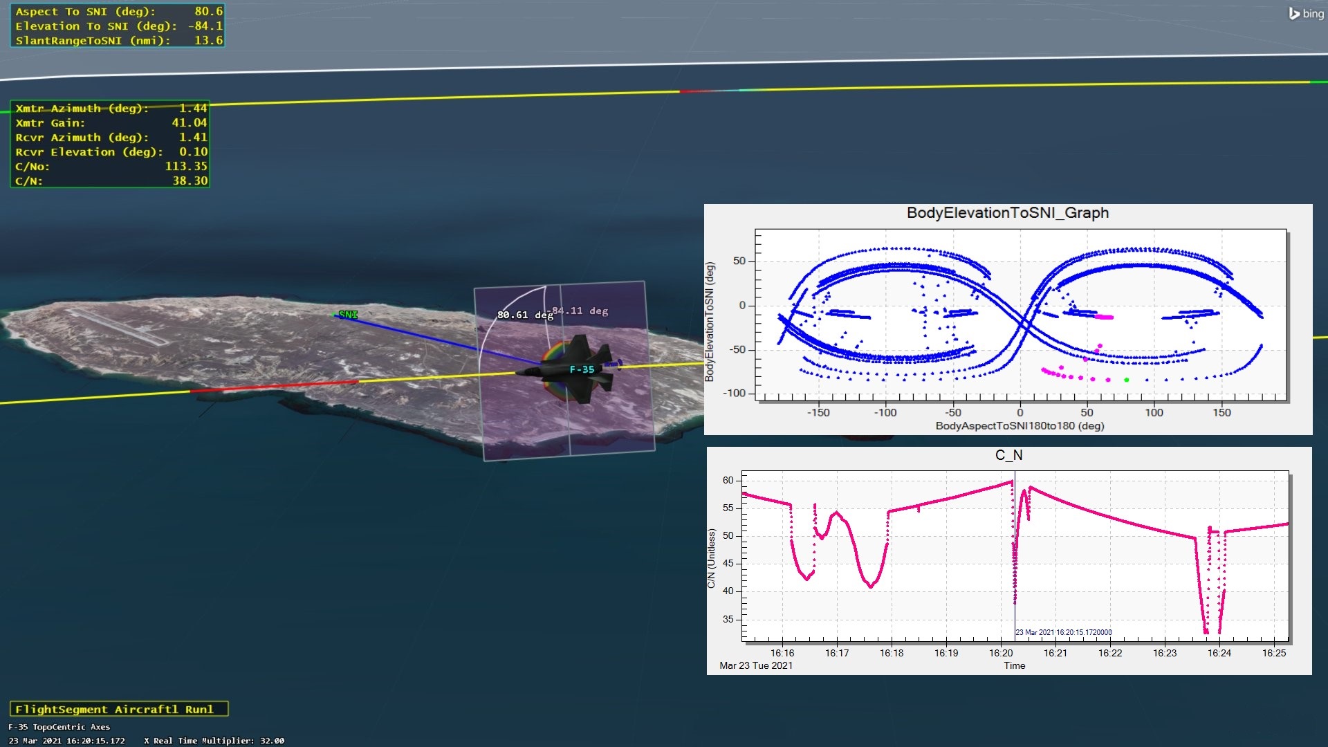 Build and validate more detailed tests by using the System Tool Kit® (STK®) application’s high-fidelity platform performance models, propagators, line-of-sight analysis, and the STK application's Communications and Radar analysis tools. With these tools, you can construct various test geometries and evaluate the expected Measures of Performance (MOPs). Coordinate the timing and position of all dynamic and stationary test assets (ownship, wingmen, refuel tankers, satellites, ground targets or emitters, etc.) by simulating them in a common environment that includes local terrain and atmospheric models. The TETK capability provides you with a much better understanding of more efficient ways to achieve the desired MOPs with the assets available.