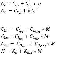 The Four Points Aerodynamic model turns four specified design points into an "all envelope" model, akin to an external model, except that it is valid over all airspace. This allows you to create a full blown model without requiring computationally expansive runs to populate an external aero file. It imposes the concept that the aerodynamic values for Cl0, ClAlpha, Cd0, and K (induced drag coefficient) are all linear functions of Mach (they have a constant and a linear term x Mach number).