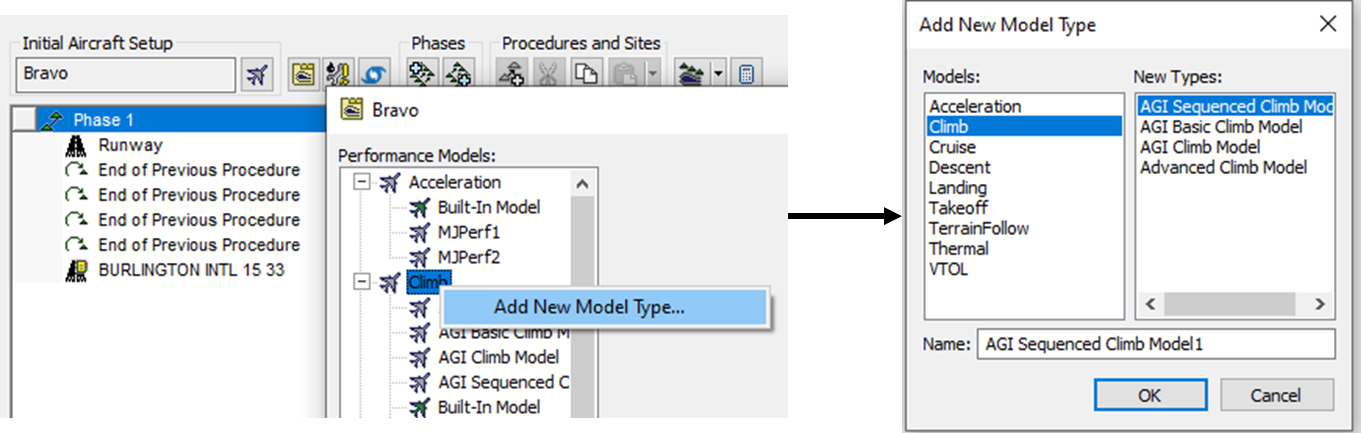 For each performance phase (such as acceleration, cruise, descend), there are several types of performance models to choose from. Built-in models default to basic models that require minimum information to calculate a trajectory. Also available are additional AGI models that allow for more detailed calculation, such as sequencing climb by altitude/fuel flow/speed. These performance models can be accessed by right-clicking in the aircraft properties window under performance models (see figure 1). Finally, advanced flight models can be built from the advanced fixed wing tool. Advanced models use aircraft propulsion and aerodynamic parameters to determine performance models. Each performance model is described in its own Help topic in this section.