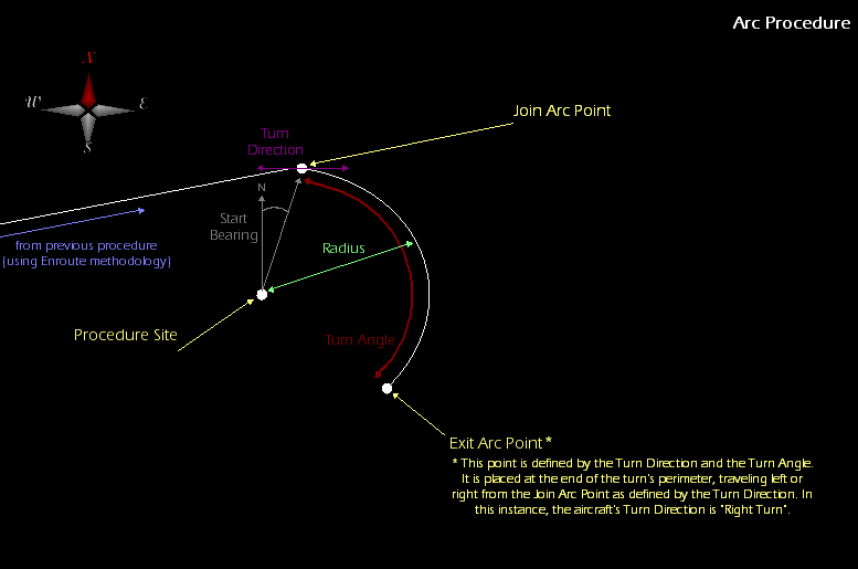 An Arc Enroute procedure is a maneuver along the perimeter of a circle of a user-specified radius, in which the velocity vector of the aircraft is maintained perpendicular to the vector from the current position to the procedure site. The center point of the circle is the procedure's site.