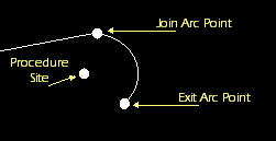 The procedure contains three control points - the procedure site, the Join Arc point, and the Exit Arc point - as indicated in the diagram below. The Join Arc point is placed relative to the procedure site, along the Start Bearing and at a distance equal to the Radius. The Exit Arc point is placed at the end of the arc as defined by the Turn Angle.