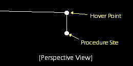 The procedure contains two control points - the procedure site and the Hover Point - as indicated in the diagram below. The procedure site is defined as the point at which the aircraft is landing. The Hover Point is placed at an altitude equal to the Altitude above point parameter, directly above the procedure site.