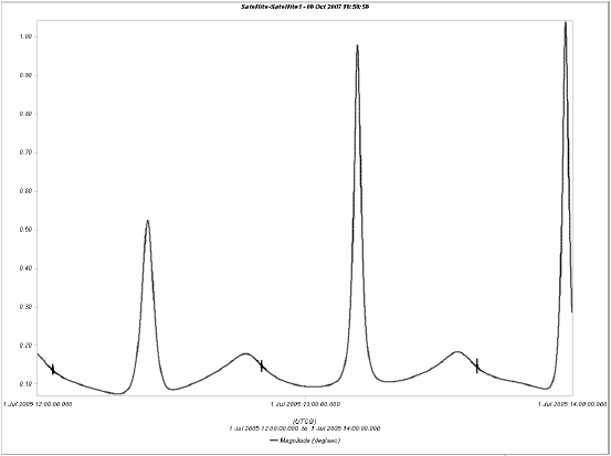 The following figure shows angular velocity in J2000 using 10 second samples and third-order attitude interpolation.