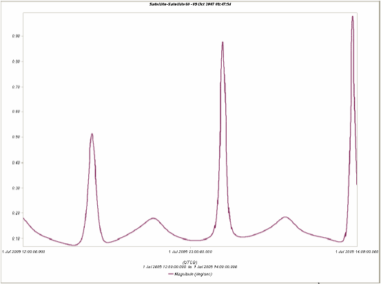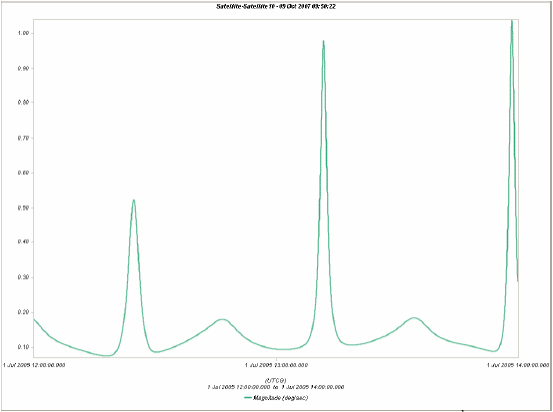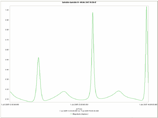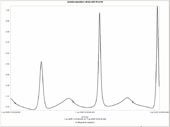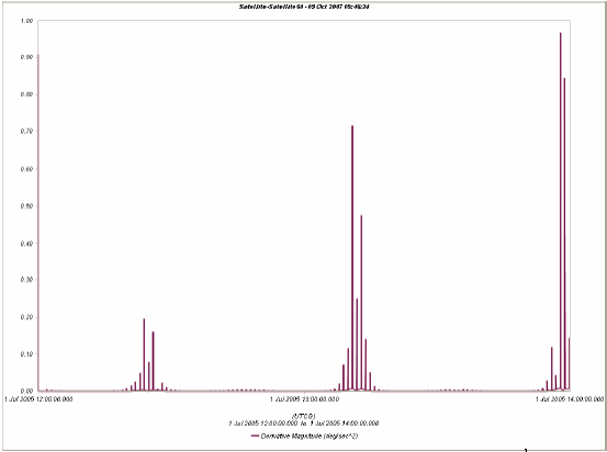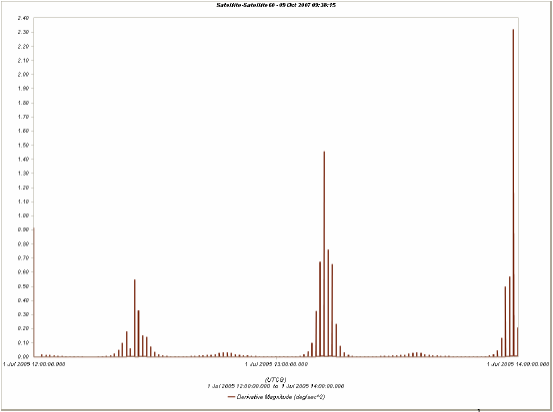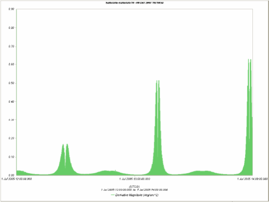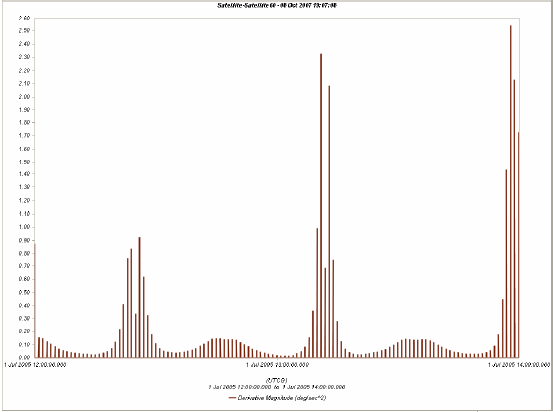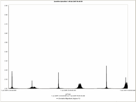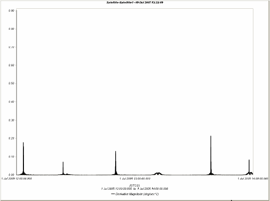 The following figure shows angular acceleration in J2000 using 60-second samples and third-order attitude interpolation.