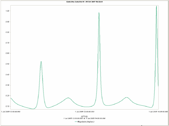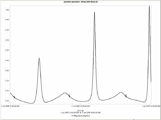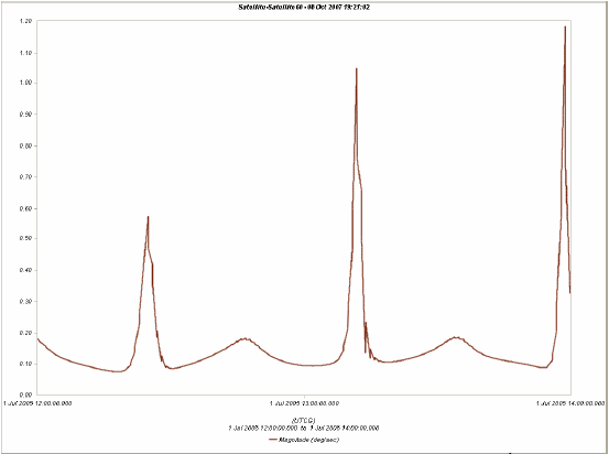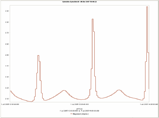 The following figure shows angular velocity in J2000 using 60-second samples and third-order attitude interpolation.