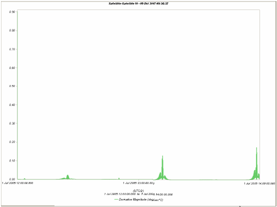 The following figure shows angular acceleration in J2000 using 10-second samples and third-order attitude interpolation.
