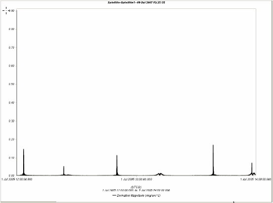 The following figure shows angular acceleration in J2000 using 1-second samples and third-order attitude interpolation.