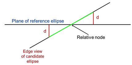 The goal of the time filter is to identify time intervals when each object in a pairing is close enough to the elliptical representation of the other objects trajectory to have a conjunction. The actual metric computed is the distance of the reference object from the orbit plane of the candidate object, see the diagram below. Since this distance is always guaranteed to be less than the actual distance between objects, the metric is a conservative proxy for the separation distance. This filter works on the premise that both objects have to be in the right place at the right time for a conjunction to occur.