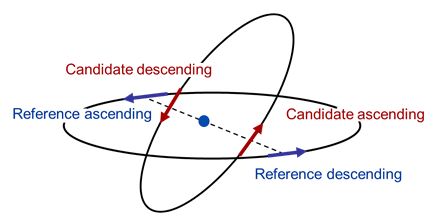 Intervals are generated for each object independently and are anchored to the relative node between the two orbits. The condition for a possible conjunction is that an interval around the relative ascending node for the reference object overlaps with an interval around the relative descending node for the candidate object or visa versa. Like the orbit path filter, the time filter is limited to cases where the trajectories are not coplanar and neither object is maneuvering.