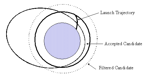 The orbit path pre-filter is used to cut any candidate object whose orbital path does not come within a specified distance of the orbital path of the reference satellite. This filter does not consider the position of the satellites at specific points in time; only the paths in inertial space are used.
