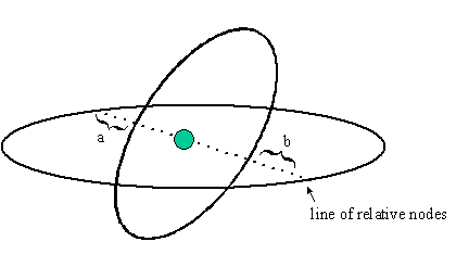 In the above figure, assume that one of the ellipses represents the reference object and the other represents a candidate close approach object. The candidate passes the test only if the shorter of the distances a and b is less than or equal to the minimum allowable distance (i.e., the Threshold set in the Close Approach window). This filter is available only for satellites and should not be used if the ephemeris of the reference object contains orbit maneuvers.