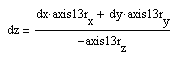 Define axis13r as the sum of axis12r and axis23r; the compound miter is perpendicular to axis13r and passes through r2r. In the new frame the r2r end point adjustment dz for each parallelepiped is found by examining the first tube's off-axis positions dx and dy through the equation: