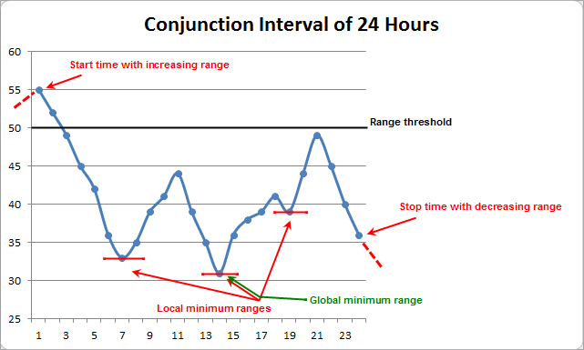 - Global + Local - A conjunction interval is reported if a secondary object crosses the threshold range within the interval time; each local range minimum (i.e., a range rate of zero) within the interval is reported as a separate event with its corresponding ConjTCA. In addition, an interval endpoint time will be reported as a separate event with its corresponding ConjTCA if it is the global range minimum over the interval.