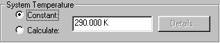 You can set System Temperature by selecting the Constant option and entering a value directly. Alternatively, you can have STK calculate the system temperature for you. To do so, select the Calculate option and click Details..., bringing up the System Temperature window. This window allows you to specify the parameters that STK will use in calculating system temperature: