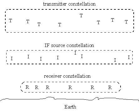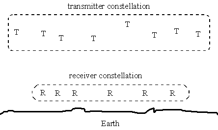 The following figure represents an elementary CommSystem, consisting of a constellation of space-based (or air-based) transmitters and a constellation of Earth-based receivers. Many other configurations, including the direct opposite of the one shown here, are possible.