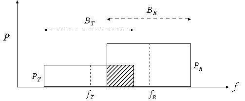 The interference analysis gives the power flux density relative to a reference bandwidth, typically 4 kHz, 40 kHz, or 1 MHz when reporting or graphing the results. The interference analysis method takes into account the bandwidth of the receiver as well as that of the interfering transmitter and includes only the overlap (if any exists) between these two in the denominator when calculating carrier-to-noise ratio. The difference is illustrated in the following graph showing power, frequency. and bandwidth for a receiver R and an interfering transmitter T.