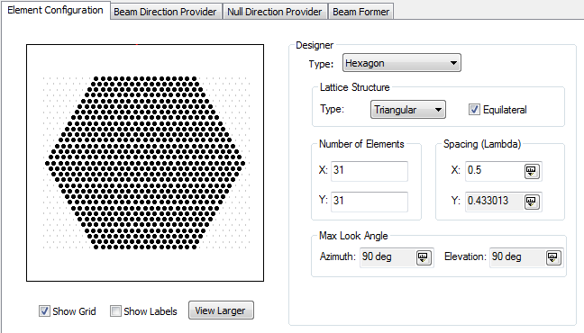 The Element Configuration consists of element grid points, and each grid point has a unique ID number. Not all Element Configuration Types provide grid points other than the original element positions. You can enable or disable grid points to represent failed elements, to represent eliminated elements due to physical obstructions, or to model Minimum Redundant Arrays (MRA).