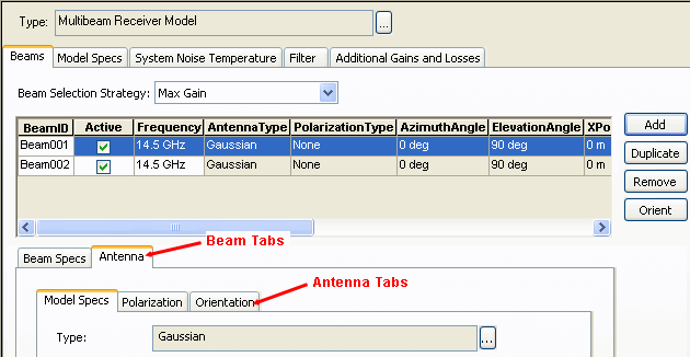 Use the Beams tab to define parameters for one or more selected beams. The Beams tab, shown below, contains a Beam summary table, a Beam Selection Strategy field, and two more rows of tabs; one for beam parameters, and one for antenna parameters. Use the summary table to perform an add, duplicate, remove, or orient operation on one or more beams. You can also use the summary table to change the certain values for a selected beam. Use the Beams Specs tab and the Antenna tabs to change values for one or more selected beams.