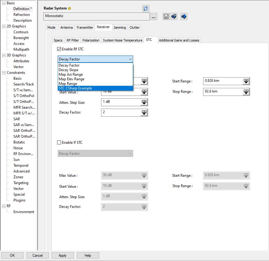 You can create your own plugin to provide the radar STC. The data should have the same format as for an external STC file. For more information on building and registering a plugin for STK, see Extend the User Interface Using Plugins. After you have registered your radar STC plugin, it will appear as an option for Rf STC and If STC on the STC tab of a radar Receiver tab. In the following image, the radar STC plugin is called "STC CSharp Example."