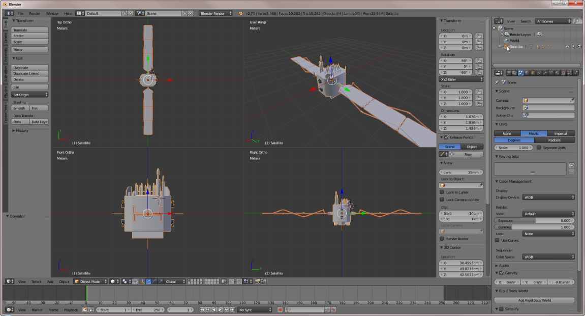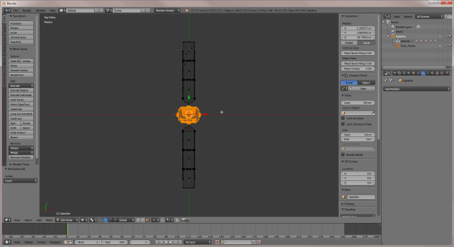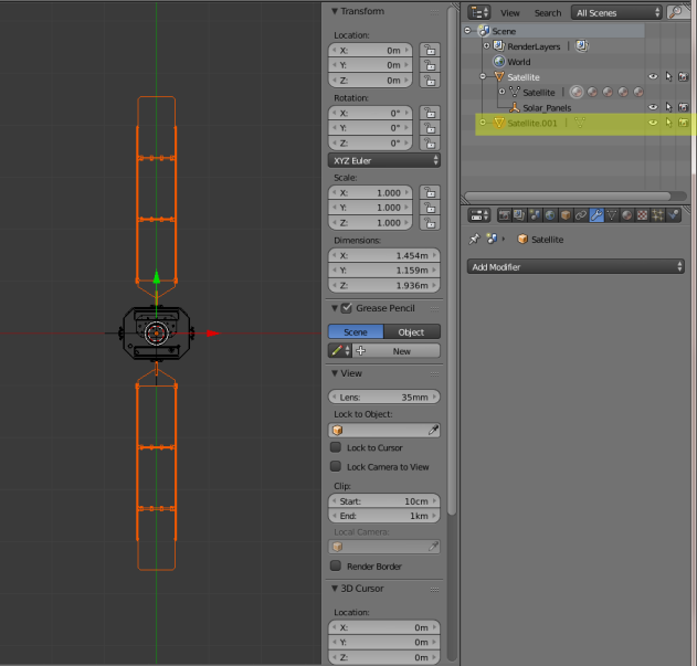 - In the Outliner panel, select the layer named Satellite. Looking at the Numeric tool bar, you should notice that the model has been rotated 90 degrees about the X and Z axis.