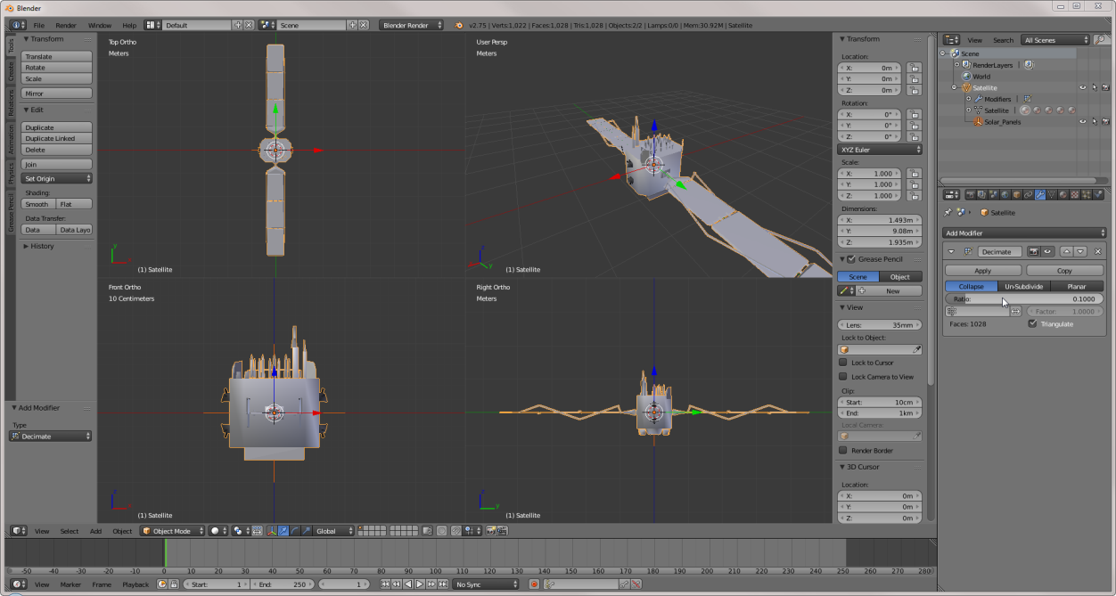 - Decimate shows the face count of your object, which is the number of polygons that you want to minimize so that your object still looks OK but in as few polygons as possible. Look at the Face Count, which currently stands at 10282 polygons and try modifying the different decimation options, taking a look around the model,. Take a moment to adjust this value to a minimum that you are happy with while also trying to get the face count as low as possible (for EOIR, below 1,000 polygons is optimal). With this example, changing the Collapse ratio to 0.1 keeps the important body structure modeled well enough but has reduced the face count from 10282 to 1028, a 90% reduction.