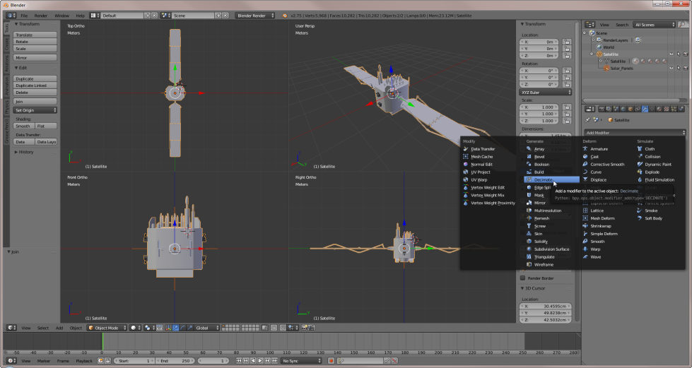- Reduce the number of polygons as much as possible so that it will be able to load into EOIR and render quickly. With your object selected in the 3D window, in the Properties panel select the Object Modifiers menu option. Then under the Add Modifier option, select Decimate.
