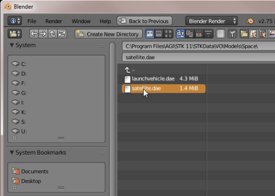 For more detailed information on converting model files for STK using Blender, see "How do I convert my model to MDL or Collada format?" FAQ. You can get to this FAQ from support.agi.com.