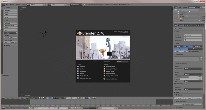 The images in this tutorial are from Blender version 2.75. Blender opens up with a splash screen and a default scene. For the latest version of Blender, see www.blender.org.