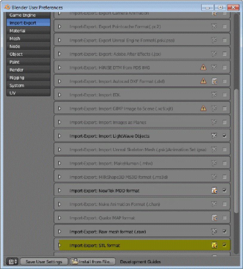 - If importing an STL file, select to the Blender User Preferences panel and click Ctrl+Alt+U in the Add-ons section under Import-Export Then activate the STL plug-in.