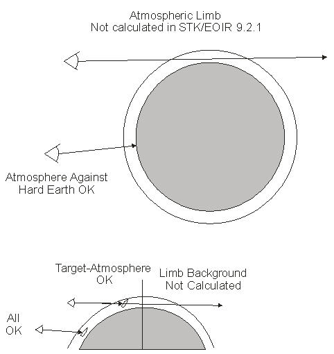 The amount of atmosphere traversed by a ray affects the calculations described above. EOIR calculates this value for all atmospheric geometries of sensor and target location, except for space to atmosphere to space.